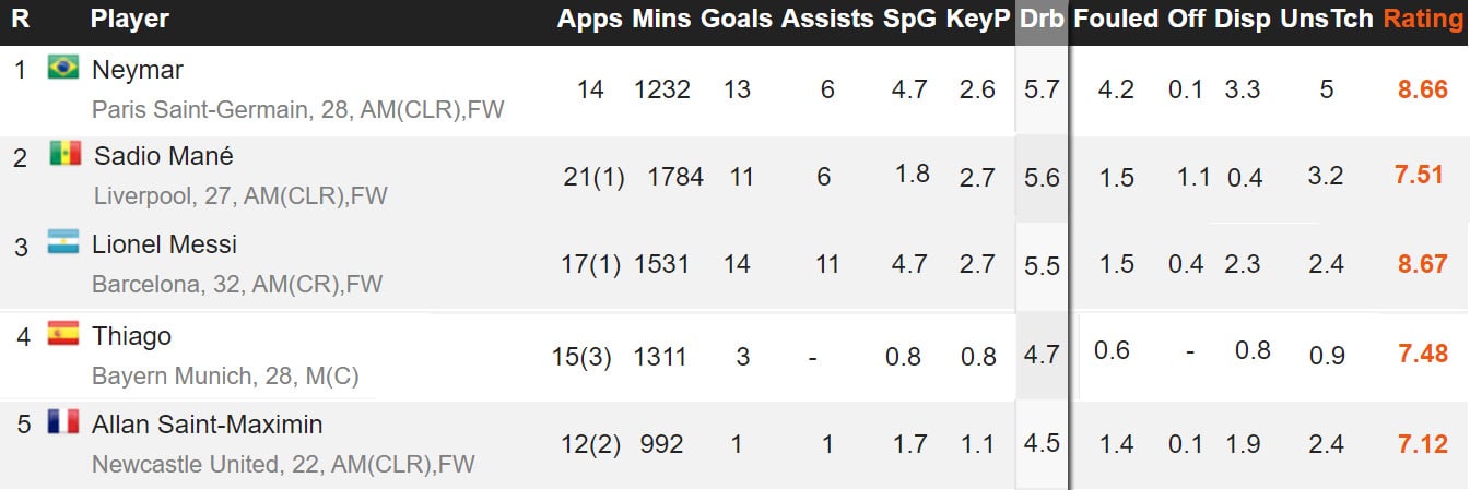 Dans le reste du tableau, on retrouve le virevoltant milieu de terrain espagnol du Bayern Munich, Thiago Alcantara (4è, 4,7 dribbles/match), et le jeune ailier français de Newcastle United, Allan Saint-Maximin (5è, 4,5 dribbles).